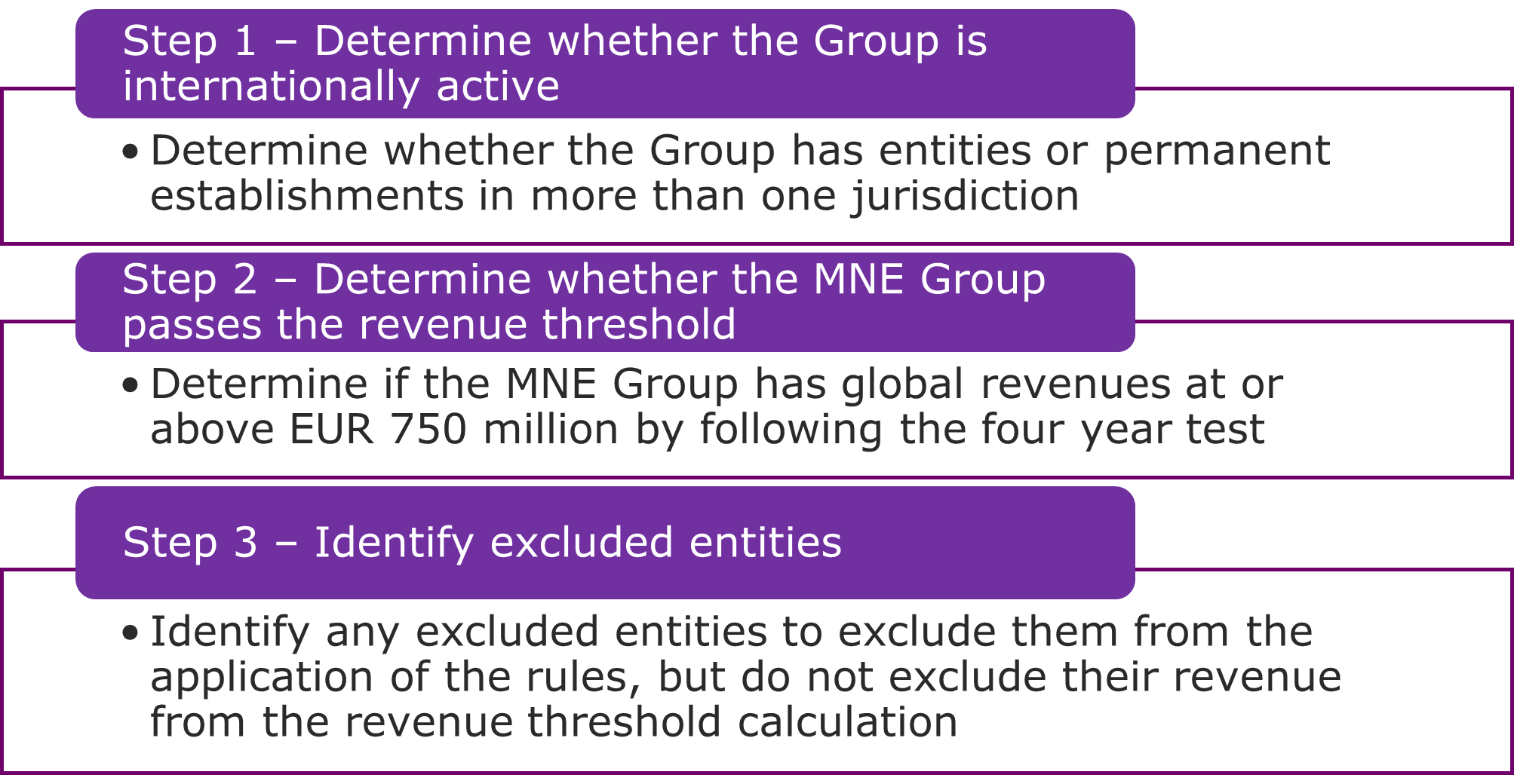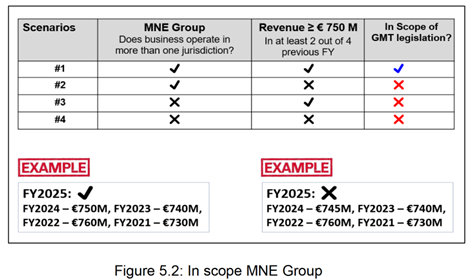 Paragraph 17 of the Pillar Two Implementation Handbook[2] explains that “DMTT rules include all the basic steps that an MNE Group must go through in order to calculate its top-up tax liability”, and that the first step is to determine whether the group is within scope, i.e., whether it qualifies as an MNE Group.